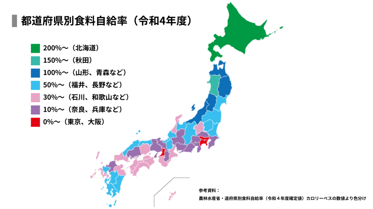 北海道の食料自給率は200%を超えており、自給率0%の東京や1%の大阪といった大都市圏を含む、日本全体の食を支えています。